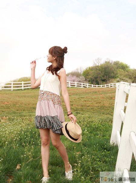 碎花拼接背心连衣裙,和田园美景融为一体。搭配巴拿马草帽,做个可爱的乖乖女哦!!