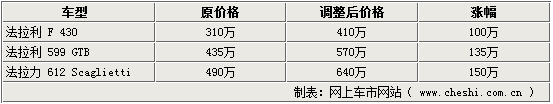 据法拉利授权经销商处销售人员介绍,由于受消费税上调影响,在售的几款法拉利车型的售价都所调整,F430,599及612车型分别在原价的基础上增加了100万、135万和150万的售价。同时销售人员还透露,在涨价后购车及预订车型后,因生产及运输等原因各位消费者还需等待9个月之久才可提车,看来想要买一辆豪华跑车不仅要拥有财力更要有耐心才可以。
