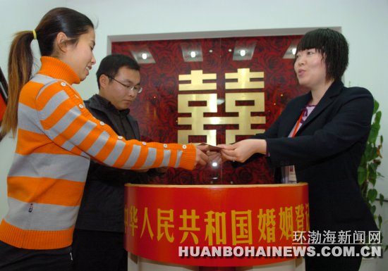 图为12月1日,该局婚姻登记处工作人员正在为新人发放结婚证。李连君、吕光宇摄