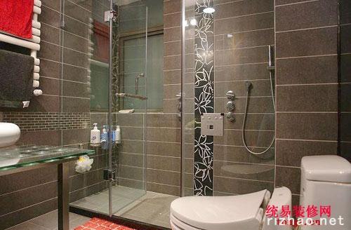 墙体上的棕色瓷砖构成了整个房间的主要色调,而墙体上镶嵌着的黑色花瓣纹路的装饰瓷砖,又使得整个卫生间不显得单调。