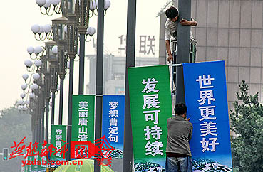 随着“曹妃甸论坛”召开的日益临近,唐山“全身上下”都“散发”着迎论坛的气息。细心市民外出会发现,市区主干道的灯杆上挂满了诸如“发展可持续”、“盛邀四海宾客,办好曹妃甸论坛”等表达唐山“心情”的宣传标语,各个公交站台宣传栏里、公交车车身和车载移动媒体上几乎处处都可以感受到喜迎论坛的浓浓气氛。  燕赵都市报冀东版     张志军 摄