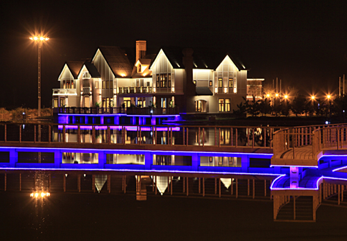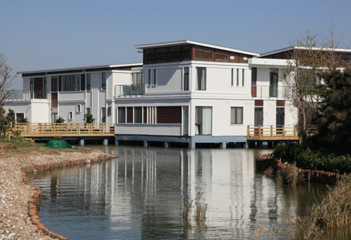 曹妃甸国际会所坐落于唐海湿地之间,占地面积275公顷。水域面积200公顷,建筑面积12997平方米,总投资2.15亿元,承担着重要的外宾接待任务。主体建筑由会所、茶室、7栋别墅以及动力中心组成。独具特色的三座小岛与七栋别墅建筑形成自然风光,让人流连忘返。