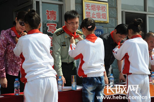 孩子们亲手为边检官兵戴上红领巾。巢军 摄