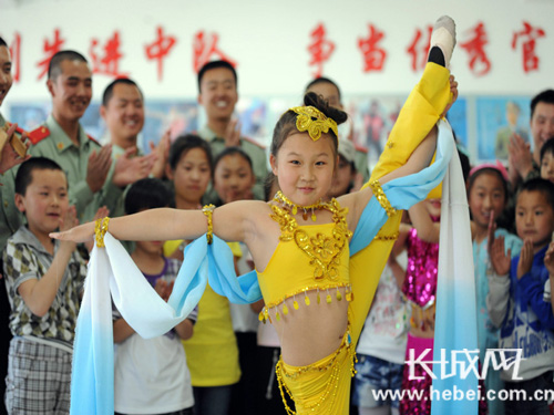 “你们的小蛋壳画的真丑。”“你们表演节目怎么都那么严肃啊?”……你一言,我一语,纯真无邪的几句话强烈的刺激了官兵的心。随后,孩子们“秀”出了自己的手工艺品,表演了诗朗诵《幸福的像花一样》、《儿童芭蕾》、歌曲《七色光之歌》。战士们表情木讷,紧跟着是热烈的掌声,小朋友的才艺给官兵们上了生动地一课。