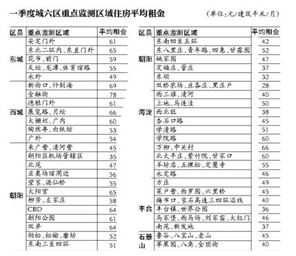 在同时公布的分区域租金监测数据显示,全市租金最高的区域为西城区的金融街,达78元/平米/月,新街口、什刹海一带也达69元/平米/月,东城区的东直门一带则为65元/平米/月,朝阳区的CBD一带为64元/平米/月,海淀区的中关村一带为66元/平米/月。