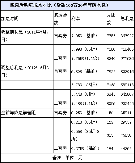 首套房100万元20年期的房贷月供将可省下150元了。中国人民银行于6月7日晚间宣布,自2012年6月8日起,将金融机构一年期贷款基准利率下调0.25个百分点。此外,央行同时将金融机构贷款利率浮动区间的下限调整为基准利率的0.8倍,这也意味着首套房贷8折优惠有可能“重现江湖”。