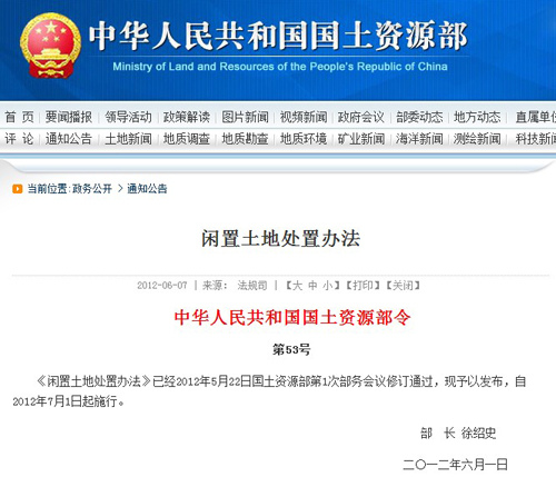 “一年未动工开发即属闲置土地。”国土资源部今日在其官网发布了2012年5月22日修订通过的《闲置土地处置办法》,再次明确了闲置土地的定义。与此同时,对于闲置土地的处理,未动工开发满一年的按照土地出让或者划拨价款的百分之二十征缴土地闲置费,未动工开发满两年的则将无偿收回土地使用权。该办法将从7月1日起正式施行。