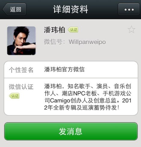 腾讯娱乐讯今日“微信大明星”迎来潘玮柏入驻加盟,同时潘玮柏也开通了腾讯微博,在腾讯的多平台实现与网友互动交流。开通首日众多粉丝即纷纷收听偶像的腾讯微博、添加微信好友。只要在微信中搜索“潘玮柏”或者“Willpanweipo”即可成功添加为好友,与偶像微信互动。
