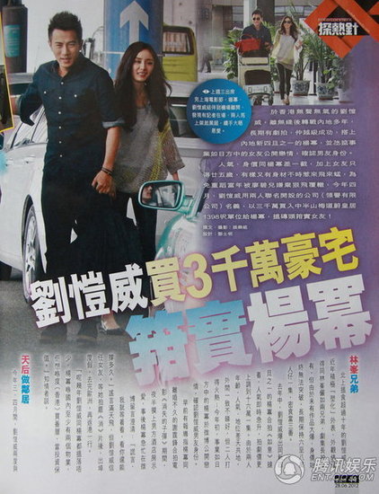有杂志曝出样子美身材好的杨幂不时惹来飞来猛,令刘恺威要在香港购入价值三千万的中半山的1398英尺单位,缚住女友。杨幂闻言立刻露出幸褔的甜笑,表示自己并不知情。相信刘凯威买下三千万豪宅后,下一步就是要计划迎娶杨幂,记者问及两位可有被家人催婚时,杨幂再次以“和刘恺威感情非常稳定”来避开结婚这个敏感的话题。