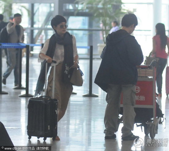 马伊琍穿拖鞋戴围巾不怕热 自推行李办登机
