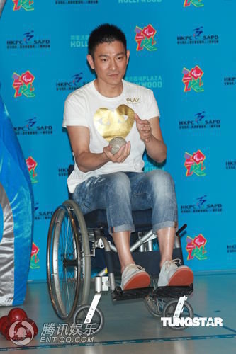 腾讯娱乐讯19日,刘德华现身伦敦2012残疾人奥运会在香港举行的誓师大会。活动上,华仔坐上轮椅与残障人士进行友谊赛,较量球技。华仔一直无间断支持香港残奥会,除了曾为残奥会献唱主题曲外,华仔更表示将会于月底远赴今届残奥会比赛场地,以表支持。