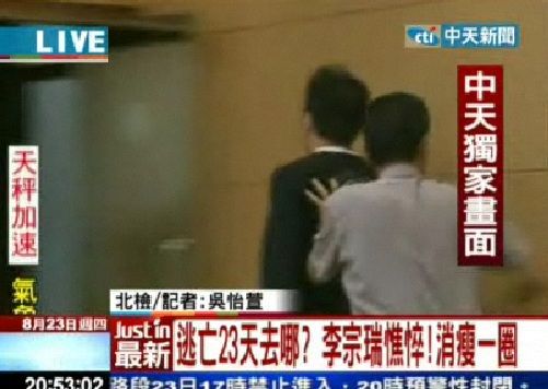 据台湾媒体中天电视台报道,李宗瑞于今晚20点30分左右现身警署自首。逃亡23天,李宗瑞已经消瘦一大圈,头发凌乱,眼睛无神,台湾媒体记者形容李宗瑞“好像很多天没洗澡了一样”,邋遢落魄。