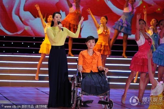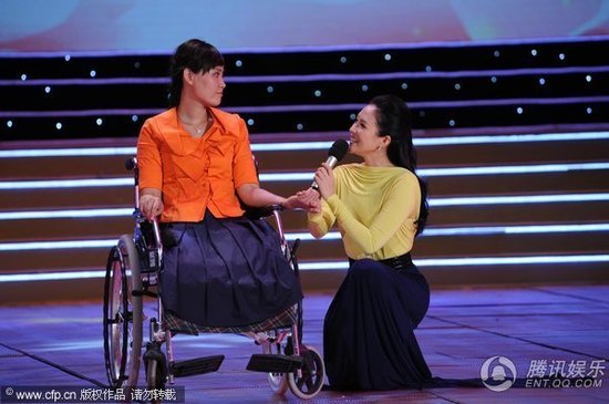 章子怡长裙录央视节目 蹲地为女教师献歌