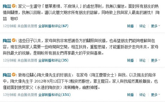 陶喆父亲陶大伟病逝 连发微博谢亲友关心
