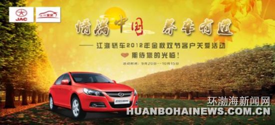 9月20日—10月15日,在中秋•国庆双节到来之际,江淮为答谢广大车主长期以来的支持,并保障双节期间客户探亲访友、自驾游等用车需求,江淮轿车特推出情满“中•国” “养”车有道——江淮轿车金秋双节客户关爱活动。