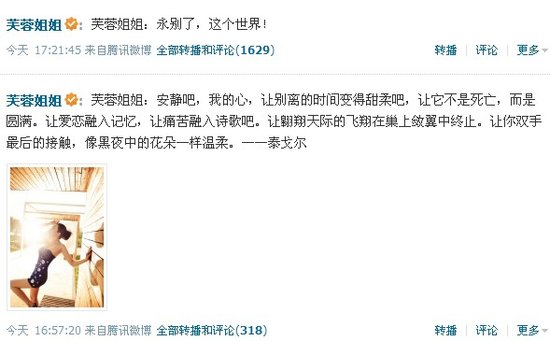 腾讯娱乐讯(文/刘莎) 9月19日下午,网络红人芙蓉姐姐突然发微博称:“永别了,这个世界!”,迅速引起网友热议,不少人担心芙蓉姐姐轻生而留言劝说,也有人质疑炒作之嫌。腾讯娱乐第一时间致电芙蓉姐姐经纪人林先生,他表示自己也不清楚具体情况,“现在工作人员联系不上芙蓉姐姐,已经通知其家人与之联络,尚未收到回复。”谈及她微博中与世界告别的内容,林先生猜测:“芙蓉姐姐可能想离开娱乐圈,有些累了。”