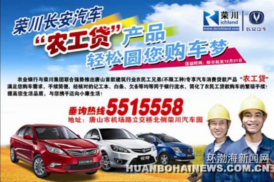 中国农业银行与荣川汽车园区联合强势推出唐山首款建筑行业农民工兄弟(不限工种)专享汽车消费贷款产品“农工贷”满足农民工的购车需求,手续简便,贷款门槛低,银行利息低,经核对的记工本、白条、欠条等均等同于银行流水,简化了农民工贷款购车的繁琐手序!提高您生活品质与您携手迈向小康生活!
