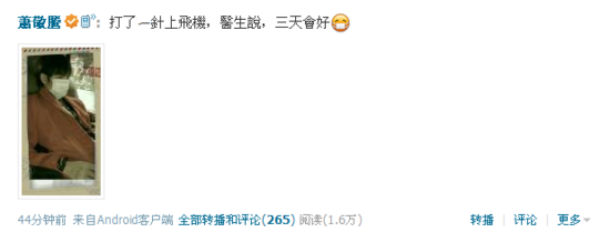腾讯娱乐讯萧敬腾近期日程颇多,即使生病也要工作。今日上午他在腾讯微博上分享了一张带病工作的相片。他说:“打了一针上飞机,医生说,三天会好”。萧敬腾劳累工作的模样令粉丝十分心疼。