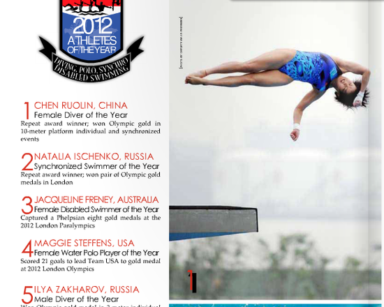 伦敦奥运会男子3米跳板决赛击败中国选手秦凯、何冲的俄罗斯名将扎哈洛夫荣膺男子最佳。在其他项目最佳运动员评选中,包揽伦敦奥运会双人、集体两金的俄罗斯名将纳塔莉亚-伊什琴科卫冕最佳花样游泳运动员;为奥运冠军美国水球队打入21球的麦基-斯蒂芬斯获得最佳男子水球运动员,率领克罗地亚获得伦敦奥运会女子水球金牌的乔科维奇获得女子最佳;在伦敦残奥会夺得5金2银1铜的澳大利亚选手马修-考德利、夺得8枚金牌的澳大利亚女选手杰奎琳-芬妮分获年度最佳男女残疾人运动员。