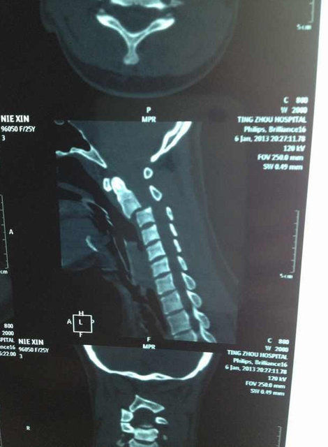 X光片显示聂鑫第二、三节颈椎严重错位。