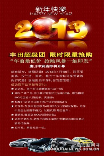 在这年终岁末来临之际,广汽丰田中润路南4S店特地为广大客户精心准备了一场超级团购狂欢盛宴。全系车型均有不同程度优惠,当天决定最优惠车型超值特价车型,在享受近期价格超高优惠的同时,再加更多惊喜,真正给您想不到的超值配置。本活动将是年终岁末的最后一次团购活动。消除您的一切忧虑,把握最后的良机,怎能错过!抢购热线: 0315-2960888