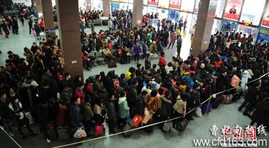 图为眉山客运中心站内前往成都的候车旅客排起长队。中新社刘忠俊摄