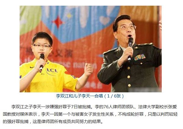 有消息称:李双江之子李天一涉嫌强奸罪于7日被批捕。李的76人律师团领队、法律大学副校长张爱国教授对媒体表示,李天一因第一个与被害女子发生性关系,不构成轮奸罪,只是以判罚较轻的强奸罪批捕,这是律师团所有成员共同努力的结果。此消息已被证实为虚假内容。经凤凰娱乐搜索发现中国并没有大学叫法律大学,更没有名为张爱国的副校长。