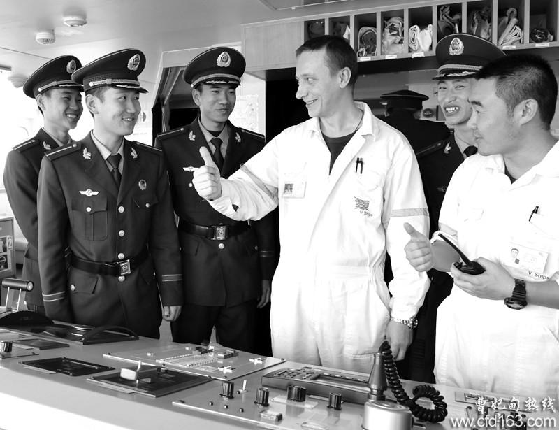 3月15日靠泊在曹妃甸原油码头的中国香港籍油轮“大洋号”迎来了一批特殊的客人,曹妃甸边防检查站官兵与曹妃甸海事处的工作人员共20余人,在“大洋号”大副姜鹏的带领下,参观了该船。据船方介绍,该船是目前世界上船身较长的一种油轮。船长萨沙来自乌克兰,他用英语向官兵们介绍了驾驶室每一个设备的作用,官兵们一面认真的听讲解,一面用英语与他交流,提出各种各样的问题。图为乌克兰籍船长萨沙伸出大拇指对边检官兵的优质服务表示赞许。(李梦娇/摄)