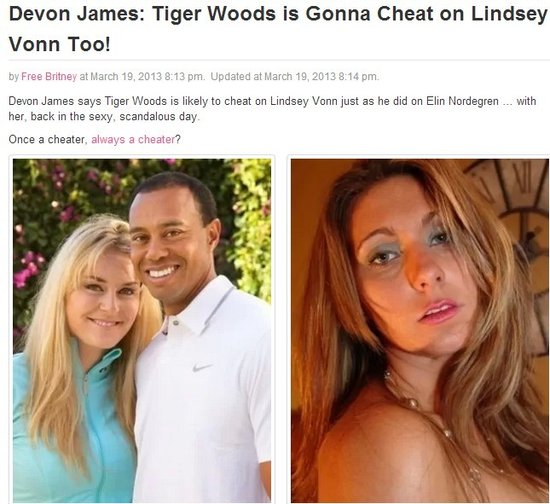 北京时间3月20日,泰格-伍兹周一通过网络媒体,确认了与滑雪奥运冠军林赛-沃恩的恋爱关系。然而作为伍兹昔日情妇的德文-詹姆斯,对于这对“冠军之恋”并不看好,甚至直言伍兹将来会欺骗乃至背叛沃恩。