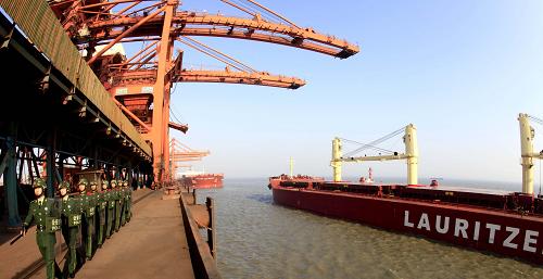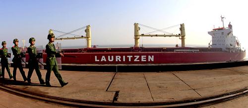 曹妃甸边防检查站的官兵在矿石码头巡逻(4月2日摄)。记者从曹妃甸边防检查站获悉,曹妃甸口岸今年一季度出入境船舶738艘,同比去年增长45.8%,进出口货物达3800万吨,同比去年增长24.8%,创历史新高。新华社发(王小雪 摄)