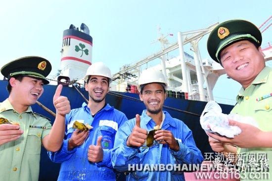 6月8日,河北省公安边防总队曹妃甸边防检查站的官兵与外籍船员一起品尝粽子。传统节日端午节即将到来之际,曹妃甸边防官兵与驻地居民一起举行了“粽香飘港湾,端午话友谊”包粽子比赛,并为停靠在曹妃甸码头的希腊“天使中特号”的外籍船员们送上自己包的粽子,让他们感受端午节的气氛。记者 郑勇 摄