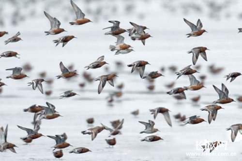 长城网唐山7月27日电(肖曼)近日,在曹妃甸湿地的滩涂上,成群的来自澳大利亚的红腹滨鹬、红颈滨鹬等鸻鹬类水鸟经过6天6夜的不间断飞行来到曹妃甸湿地,在此休憩20天左右,补足能量后再飞行5天5夜,到达繁殖地西伯利亚。