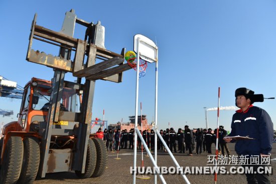 曹妃甸港口有限公司通用码头分公司自成立以来,先后获得“全国工人先锋号”“唐山市巾帼文明岗”等荣誉称号。为更好地调动起广大职工的技术练兵积极性,公司举办了首届职工技能比武大赛,门机司机、理货员、指导员、电工、钳工、铲车司机等10个工种展开角逐。图为叉车障碍投篮赛场。记者 赵勇 蓉辉 通讯员 赵品 摄