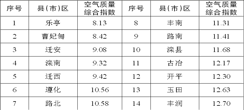 从排名结果来看,我市多数县(市)区3月空气质量排名较2月没有较大幅度变化。从环境空气质量综合指数来看,各县(市)区指数差距不大,排名第一位的乐亭县数值为8.13,排名最后的丰润区为12.70。