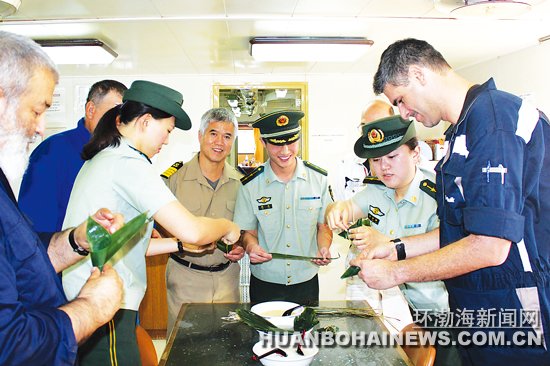 环渤海新闻网消息(李梦娇 陈龙 杨林摄)在端午节到来之际,河北公安边防总队曹妃甸边防检查站执勤业务科官兵,带着事先准备好的粽叶、糯米,登上靠泊在曹妃甸矿石码头的马绍尔群岛籍“奥罗拉”号外轮,与外国船员们一起包粽子迎端午。这些来自罗马尼亚、保加利亚、菲律宾等国家的船员们都积极热情地参与进来。品尝过程中,官兵们还用英文向外国船员们介绍了端午节的由来及习俗,让外国友人感受独具中国特色的传统文化。