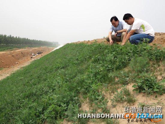 图为张唐铁路八标三分部工程管理人员正在察看“三维生态护坡”植物生长情况。