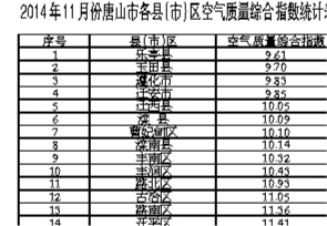 按照城市环境空气质量综合指数评价,11月份全市14个县(市)区空气质量由好到差排名依次为:乐亭县、玉田县、遵化市、迁安市、迁西县、滦县、曹妃甸区、滦南县、丰南区、丰润区、路北区、古冶区、路南区、开平区。