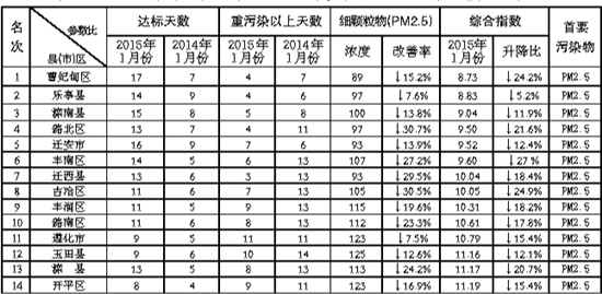 按照城市环境空气质量综合指数评价,2015年1月份全市14个县(市)区空气质量由好到差排名依次为:曹妃甸区、乐亭县、滦南县、路北区、迁安市、丰南区、迁西县、古冶区、丰润区、路南区、遵化市、玉田县、滦县、开平区。