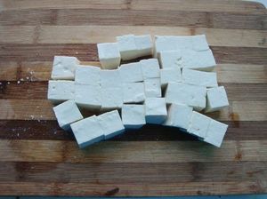 1.豆腐切成2厘米宽的小方块。