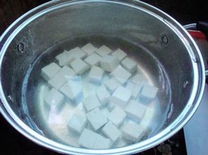 2.切好的豆腐放入沸水焯一下去除豆腥味。