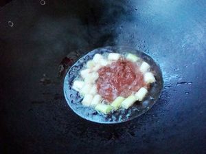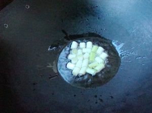 4.炒锅上火,倒入食用油烧热,下葱段煸出香味。