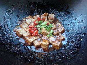 7.放入豆腐小火慢慢翻炒一会。