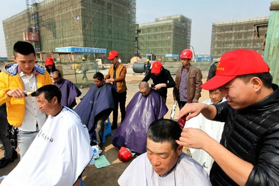图为志愿者为项目建设者理发。记者赵勇孔祥华摄影报道