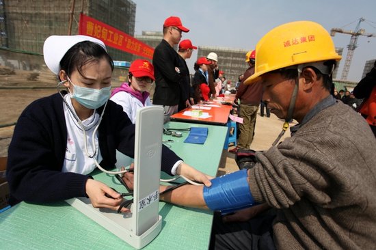 图为工业区工人医院志愿者为工地施工人员体检。记者赵勇孔祥华摄影报道