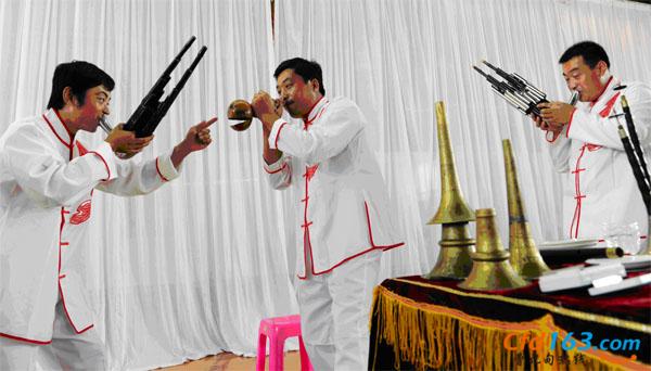 为国家级非物质文化遗产传承人姚少林(父亲)吹笙伴奏(右一)