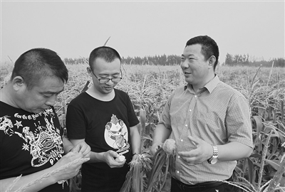 在曹妃甸区八农场,一位身形健硕、皮肤黝黑的青年人正顶着烈日,在一片甜玉米地中忙绿。只见他掰下个玉米,手法熟练地剥开外层的皮,咬了一口饱满的籽粒,细细地品味着,然后转过头跟随行的两位村民交流着该玉米品种的口感,探讨着今年的收成……
