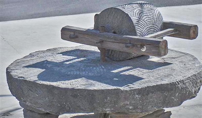 一盘石碾,它是由三部分组成。主要部分是铺底的石盘,它是一块又硬又厚的石质圆形物,一般直径都在1.5米左右,其次是放在石盘上的碾滚,它的作用是靠它滚动的压力把东西压碎压细。再一件是套在碾滚上的木框,框上有把棍,人扶把棍转圈走动达到碾压的目的。